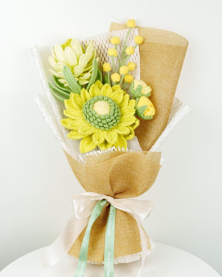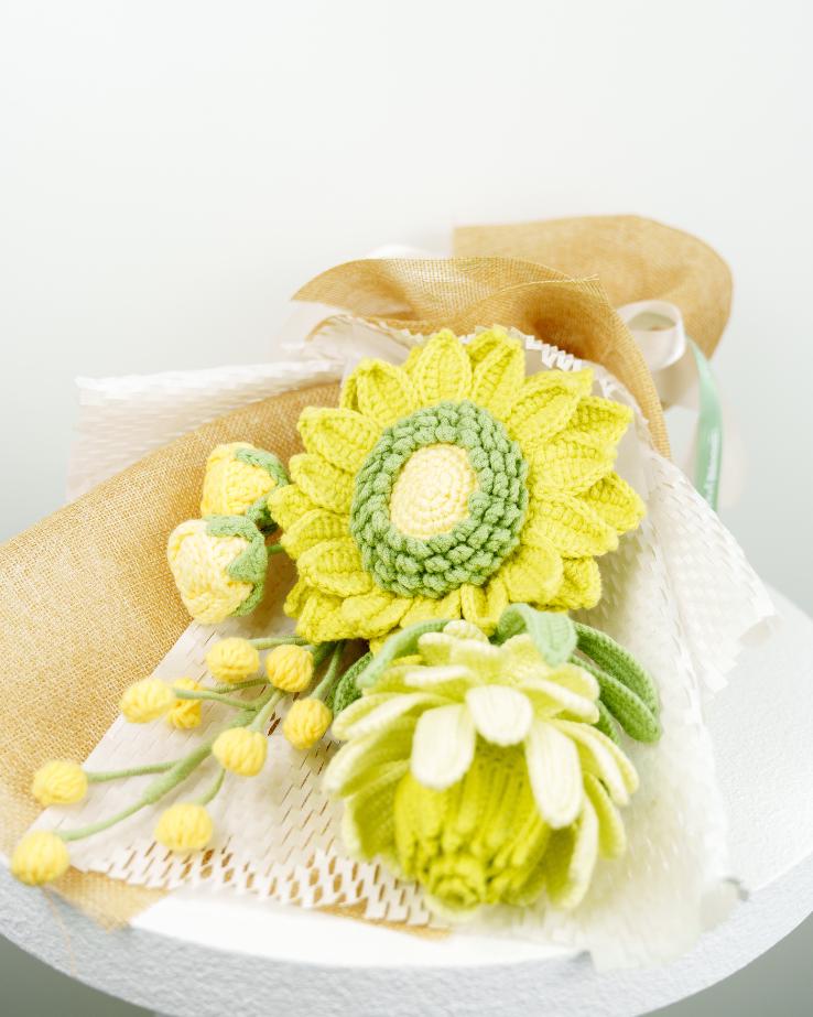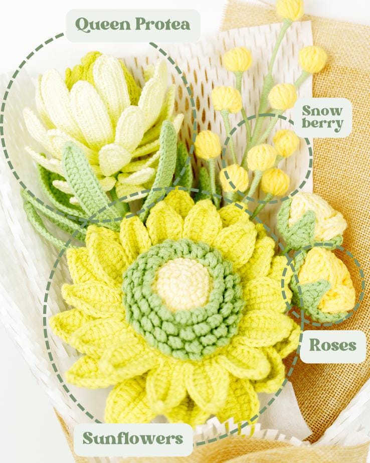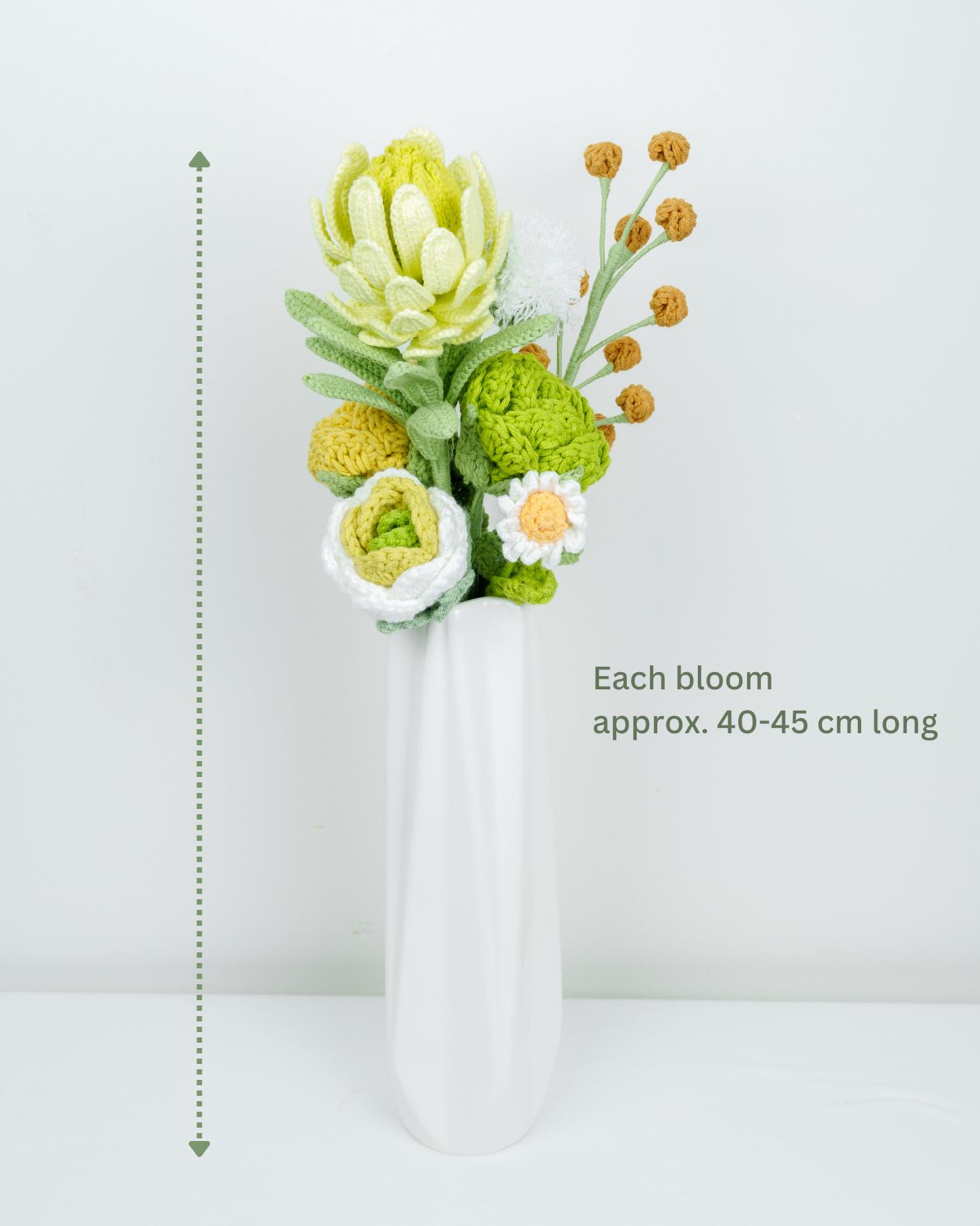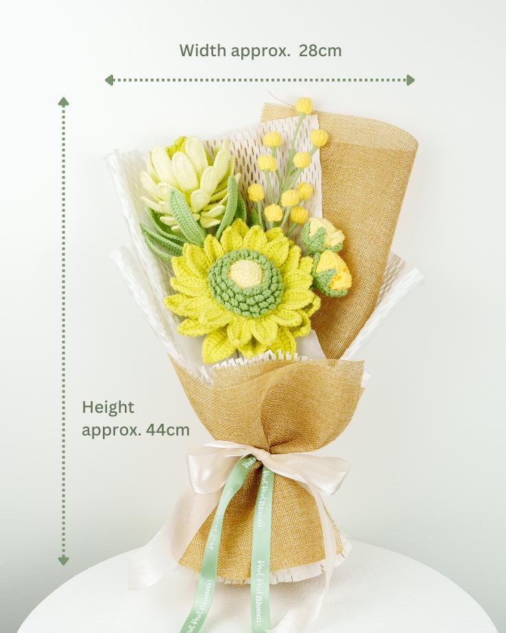 – The crochet flower stems will be slightly bent to fit the box. Buyers can straighten them back after receiving them to fit into different vases.