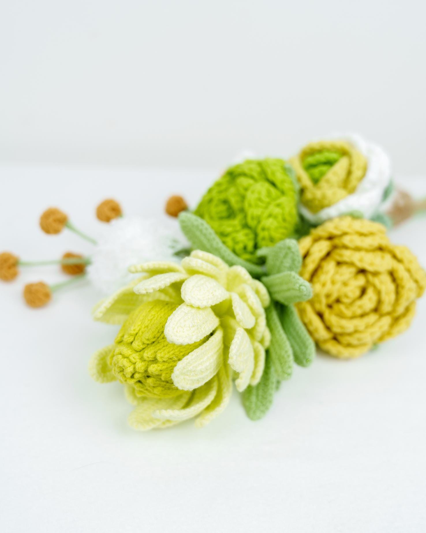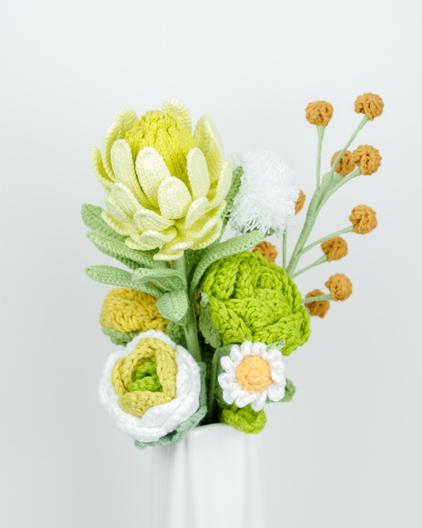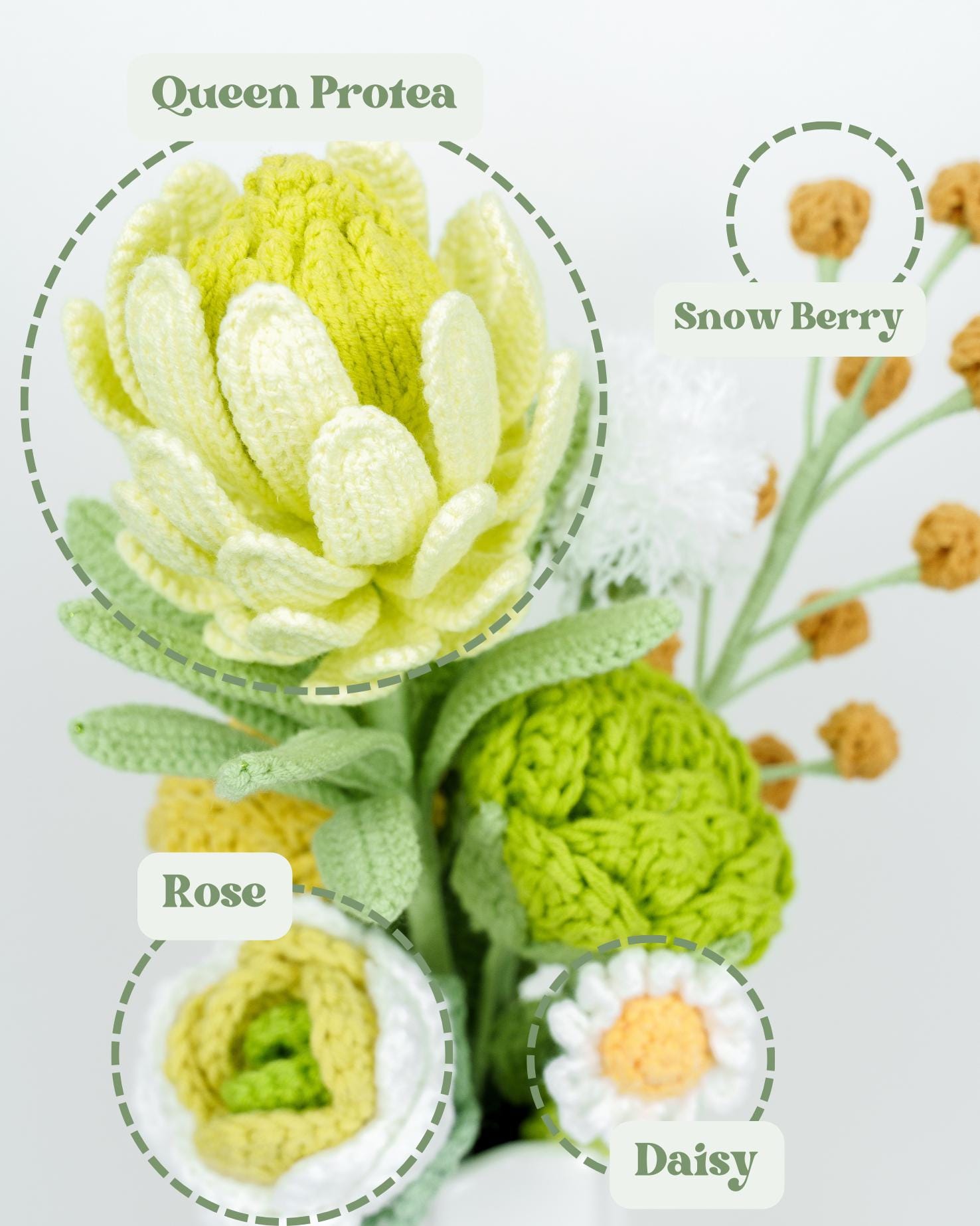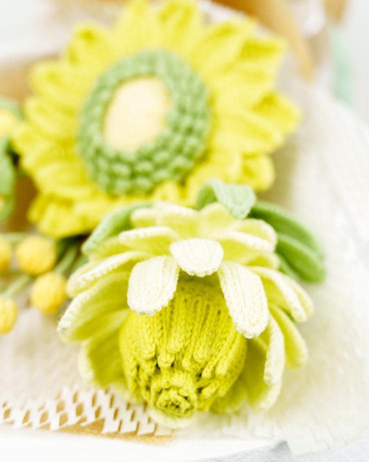 – The crochet flower stems will be slightly bent to fit the box. Buyers can straighten them back after receiving them to fit into different vases.